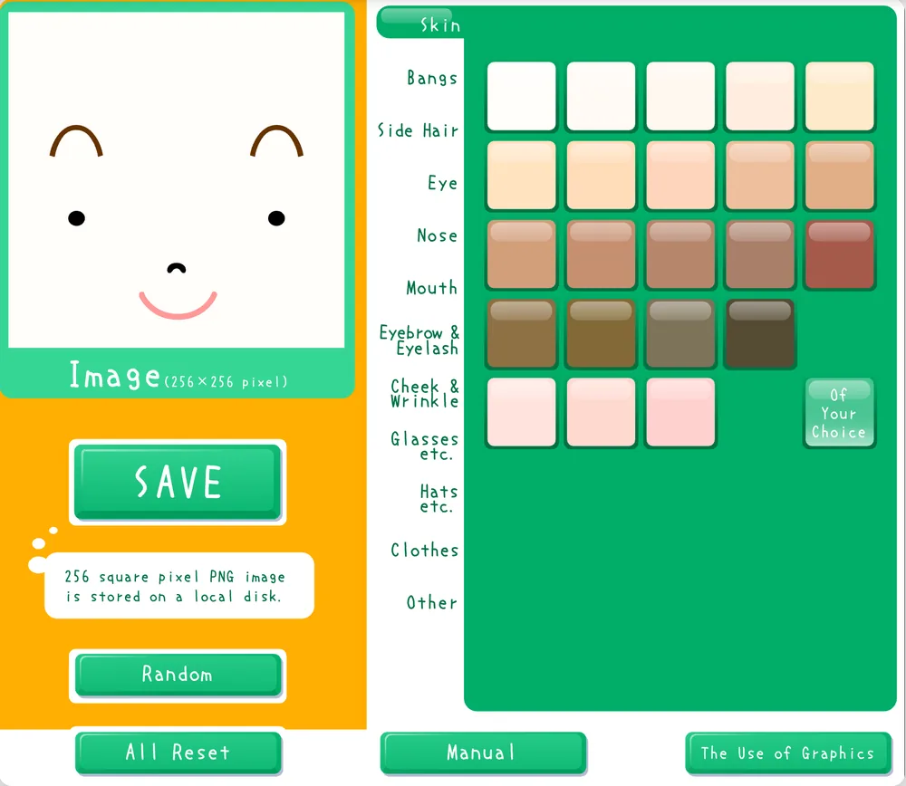 Usa Aleatorio para ideas y pulsa "SAVE" para descargar el PNG 256x256.